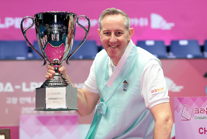 [Brilliant Billiards=신성식 기자] 3시간 여 접전 끝에 우승을 확정한 에디 레펀스(벨기에·SK렌터카)가 4년만에 당구대 위로 ‘펄쩍’ 뛰어올랐다. 6일 경기도 고양시 ‘고양 킨텍스 PBA 스타디움’에서 열린 프로당구 2025-26시즌 5차투어 ‘크라운해태 PBA-LPBA 챔피언십 한가위’ PBA 결승전서 레펀스는 조재호를 상대로 풀세트 접전 끝에 세트스코어 4:3(9:15, 5:15, 15:9, 15:10, 15:11, 8:15, 11:6)으로 승리를 거두고 ‘한가위 투어’ 정상에 섰다. 이로써 레펀스는 지난 2021-22시즌 3차전(휴온스 챔피언십) 우승 이후 3년 10개월만에 통산 두 번째 우승 트로피를 번쩍 들어올렸다. 우승상금 1억원을 더한 레펀스는 시즌 상금랭킹 1위(1억 1,400만원)에 오른 데 이어 누적 상금 3억원을 돌파해 누적 상금 랭킹 5위(3억 9,250만원)로 뛰어올랐다.