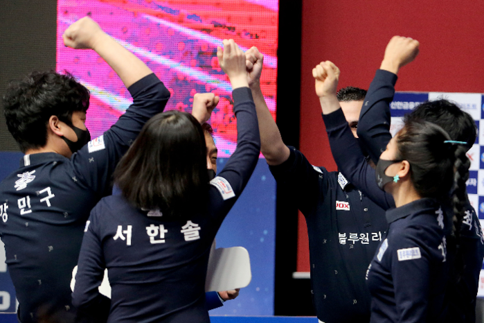 ▲ TS·JDX를 누른 뒤 기뻐하는 블루원리조트 선수들 PBA 제공 |