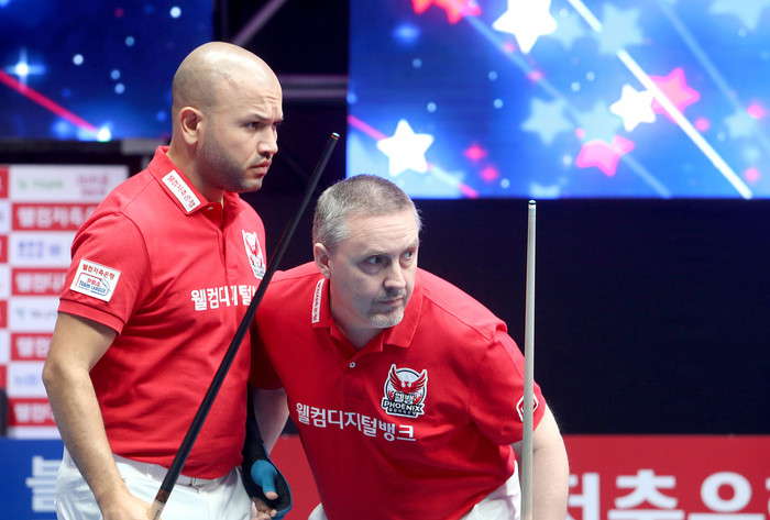 이번 시즌 팀리그가 반환점을 돈 가운데, 전기리그(21경기)에서 최강 복식을 자랑하는 팀은 어디였을까. 우선 남자 복식은 웰컴저축은행이 13승8패의 성적을 거두면서 부문 최강에 자리했다. 웰컴은 ‘PBA 최강’ 프레드릭 쿠드롱(벨기에)를 중심으로 ‘PBA 챔프’ 비롤 위마즈(튀르키예)와 서현민, 한지승이 돌아가며 호흡을 맞췄다.