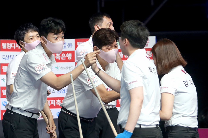 크라운해태도 팀원들의 고른 활약 속에 블루원리조트를 세트스코어 4:1로 물리치고 2라운드 전승(3연승)을 내달렸다. 크라운해태는 첫 세트부터 김재근-박인수가 4이닝만에 11:3으로 승리한 데 이어 2세트에 나선 백민주-강지은도 서한솔-김민영을 9:5(18이닝)로 물리치며 쾌조의 출발을 보였다. 3세트 에이스전에 나선 김재근은 다비드 사파타(스페인)에 9:15(9이닝)로 한 세트를 내주었으나, 4세트서 다비드 마르티네스(스페인)-강지은이 2이닝에 9점을 쌓으며 최강 호흡을 자랑했고, 기세를 이어 마르티네스가 11:7(6이닝)로 5세트를 따내며 세트스코어 4:1로 승리했다.