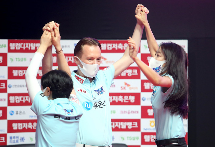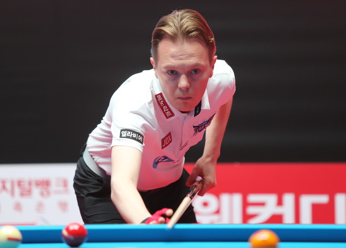 [Brilliant Billiards=김철호 기자] 30일 고양 빛마루 방송지원센터에서 열린 웰컴저축은행 팀리그 후반기 4라운드 둘째날 TS샴프와 휴온스의 경기에서 6세트 남자 단식에서 휴온스의 호프만이 TS 샴프 김종원을 상대로 11점을 한꺼번에 몰아치는 퍼펙트 큐를 선 보였다.
