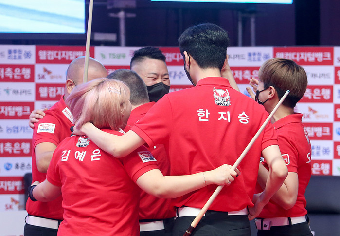 [Brilliant Billiards=박상현 기자] 하나카드 원큐페이가 최종일 패배에도 결국 PBA팀리그 전기리그 우승컵을 들어올렸다. 2일 강원도 춘천시 엘리시안강촌에서 열린 ‘웰컴저축은행 PBA 팀리그 2022-23’ 3라운드 7일차 경기를 끝으로 전기리그가 모두 마무리됐다. 그 결과 최종일 경기서 하나카드는 블루원리조트에 세트스코어 2:4로 패배하며 최종 12승9패로 전반기를 마무리했다. 같은 날 SK렌터카에 승리를 거둔 TS샴푸·푸라닭과 12승9패로 공동1위를 달성했지만 상대전적에 2승1패로 앞선 하나카드가 결국 우승컵을 들어올렸다.