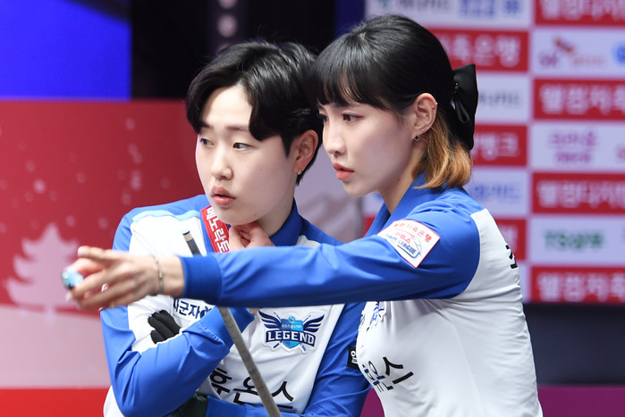 ▲여자 단식경기에 나선 NH농협카드 최혜미가 볼 공략법을 팀리더인 김세연과 협의하고 있다<PBA사무국>