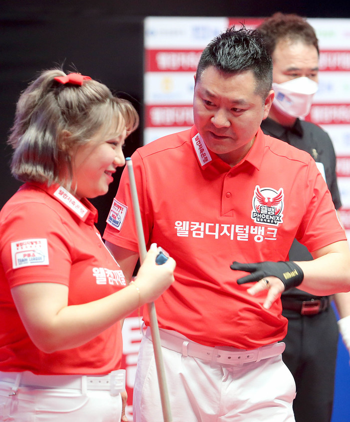 ▲서현민선수에게 공략법을 듣고 미소 띠는 김예은 선수<사진제공=pba 사무국> |