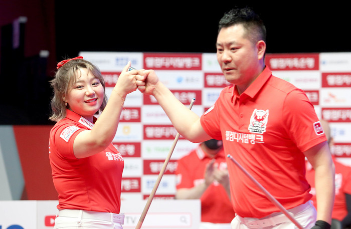 ▲ 서현민,김예은조가 점수를 올리며 방역 하이파이브를 하고 있다<사진제공=pba 사무국> |