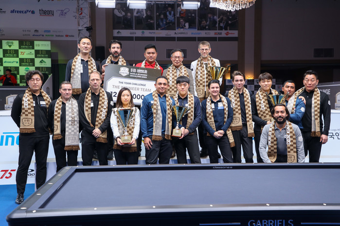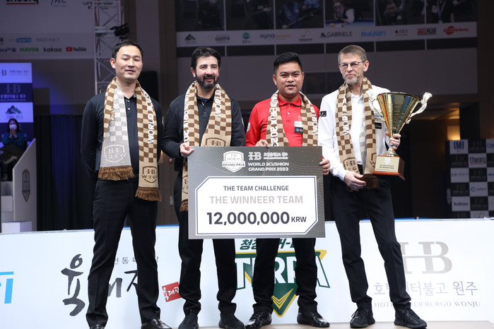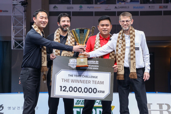 [Brilliant Billiards=김철호 기자] 22일 우리 설날 호텔인터불고원주에서는 세계최고의 3쿠션 당구 선수들이 떡국을 함께 나누고 팀챌린지 결선 토너먼트를 펼쳤다. 결승전에서 예선부터 강세를 펼친 팀브롬달과 8강과4강에서 대역전극을 펼치며 올라온 팀먹스가 만났다. 역전극의 대명사로 명성을 떨친 팀먹스는 예상과 달리 결승전에서는 막강한 힘을 발휘하지 못했다. 결승전은 팀 브롬달이120대 74로 큰 차이로 팀 챌린지의 첫번째 우승컵을 들어 올렸다.