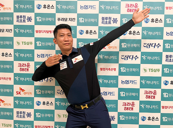 ▲이번 대회 첫 퍼펙트 큐를 달성한 베트남 응고딘 나이가 승리의 퍼포먼스를 선보이고 있다<사진제공=PBA사무국> |