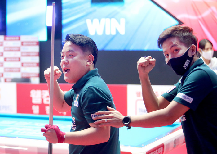 ▲ NH 농협카드 팀리더 조재호가 승리를 거두며 주먹을 불끈쥐어 보이고 있다(PBA 사무국 제공) |