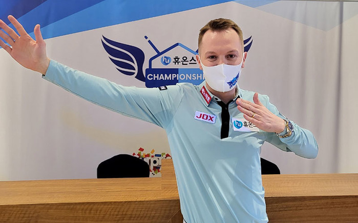 ▲ 세번째 퍼펙트 큐와 역전승을 거두며 16강에 진출한 네덜란드 호프만 세러머니를 펼쳐 보이고 있다<사진제공=PBA 사무국> |