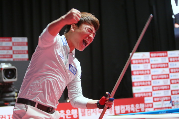 ▲4전5기만에 우승을 확정지은 강민구가 주먹을 쥐어보이며 환호하고 있다 |