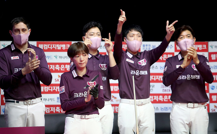 크라운해태도 5라운드부터 이어지던 7연패의 부진을 끊고 6라운드 첫 승을 신고했다. 최근 부진에 빠진 다비드 마르티네스(스페인)가 1세트와 7세트에서 승리를 보태며 휴온스를 세트스코어 4:3으로 물리쳤다. 이로써 후기리그 최종라운드인 6라운드가 4경기만을 남긴 가운데 웰컴저축은행이 12승5패로 불안한 선두를 유지했다. 이어 NH농협카드가 2위(11승 6패), SK렌터카와 블루원리조트가 나란히 3위(10승6패) 4위(10승7패)로 선두권을 바짝 추격했다. 이어 크라운해태, 하나카드가 공동 5위(7승10패) TS샴푸·푸라닭이 7위(6승10패), 휴온스가 최하위(4승13패)를 기록했다.