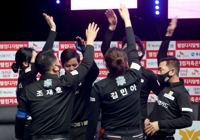 [Brilliant Billiards=유진모 기자] 프로당구 PBA 팀리그가 정규리그를 단 4경기만 남겨둔 가운데, 막판 대혼전 양상이다. 10일 경기도 고양시 소노캄고양에서 열린 ‘웰컴저축은행 PBA 팀리그 2022’ 6라운드 3일차서 선두 웰컴저축은행과 2위 NH농협카드가 나란히 공동5위 하나카드와 4위 블루원리조트에 패배했다. 이로써 1위 웰컴저축은행(12승5패)과 4위 블루원(10승7패)의 승차까지 단 2경기로 좁혀졌다.