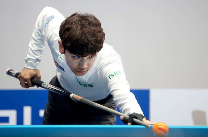 ▲2개 대회 연속 8강에진출한 강자 이상대가 볼을 조준하고 있다<사진제공=PBA사무국> |