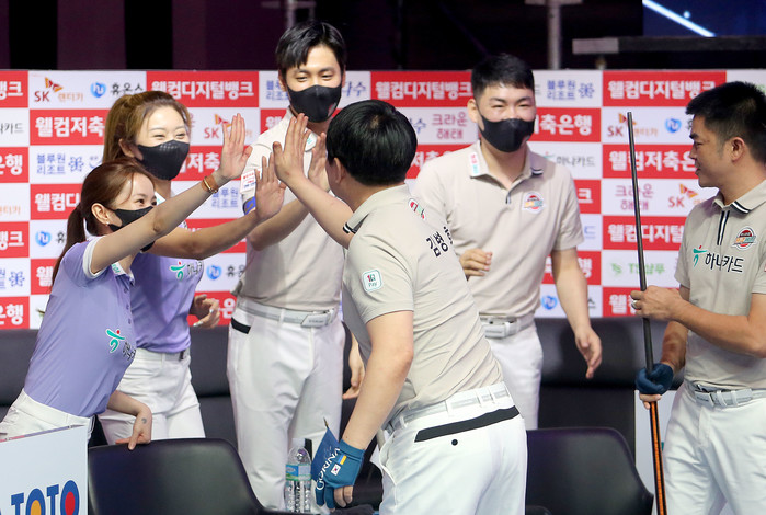 하나카드는 SK렌터카와의 경기에서 초반 두 세트를 내주며 불안하게 출발했지만 3세트 응우옌 꾸억 응우옌(베트남)이 신대권을 15:11(7이닝)으로 물리친 데 이어, 4세트 김병호-김진아 조합이 조건휘-임정숙을 9:8(9이닝) 한 점차 짜릿한 역전 승리를 거두며 승부를 원점으로 돌렸다. 하나카드는 5세트서 이상대가 에디 레펜스(벨기에)에 패배하며 다시 한 세트를 끌려갔으나, 김가영과 신정주가 나란히 6,7세트서 히다 오리에(일본), 응고 딘 나이(베트남)을 돌려세우며 대역전 승리를 거뒀다.