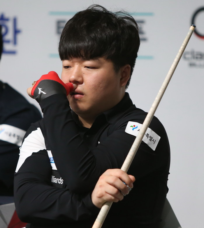 ▲ 작은 고추 조명우가 세레미 뷰리와의 경기에서 대기석에 앉아 뷰리의 경기를 관전하고 있다 |