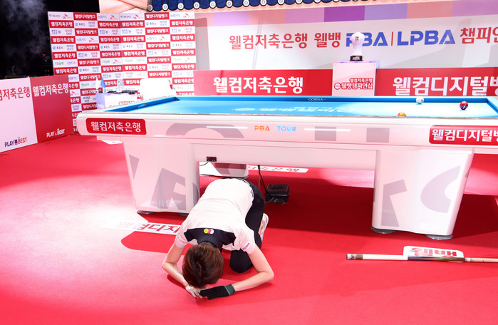 ▲LPBA 김가영에 이어 댜섯번째 우승을 차지한 임정숙이 경기 시작전 팬들에게 큰절로 인사를 올리고 있다