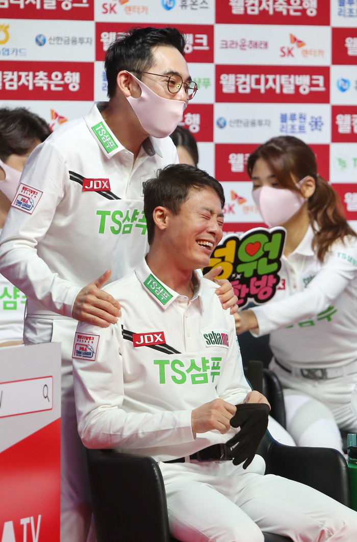 4라운드 넷째날 신한알파스와의 1세트를 준비하던 문성원을 동료 한동우가 어깨를 주물러 주자 기뻐 웃고 있다