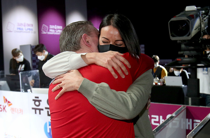 우승이 확정되는 순간.경기장을 오가며 춤을 추고 관중석에 있는 아내를 찾아서 키스를 전하자 아내가 경기장으로 달려와 품에 안기며 우승을 축하해주었다. PBA로 전향한 3년전부터 한국을 남편과 함께 오가며 그림자가 되고 내조해준 아내 LPBA경기에 참여는 하지만 이렇다할 성적은 아직 내지 못했지만 남편의 우승은 그녀의 업적이기도 하다.