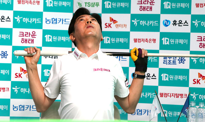 18일 PBA 32강전에 출전한 김재근이 세트스코어 1대1 상황에서 휴식시간에 큐를 목에 걸고 스트레칭을 하며 긴장을 풀고 있다