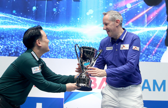 ▲ 우승자와 함께 사진을 찍은 준우승자 조재호가 우승 트로피를 익살스럽게 에디 레펜스에게 건네고 있다<pba 제공>