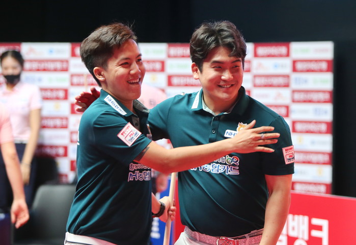[Brilliant Billiards=김철호 기자] 19일 경기도 고양 빛마루방송센터에서 열린 ‘웰컴저축은행 PBA팀리그 2021-22’ 2라운드 6일차 경기, 2위를 달리고 있는 신생팀 NH농협카드엑 유일한 1패를 안긴 블루원리조트와 NH농협카드의 경기 남자 복식경기에서 NH농협카드 응우엔 프엉림과 오태준 팀이 블루원리조트의 사파타와 홍진표에게 6이닝 15대 8로 1승을 얻고 축하해주며 벤치로 돌아오고 있다