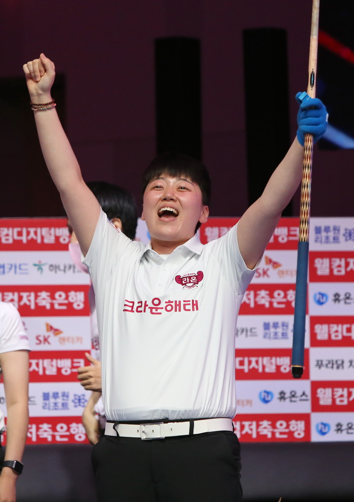 공동 2위 였던 크라운해태가 백민주,마르티네스의 2승에 힘입어 단독 2위로 올라서는데 견인차 역활을 한 백민주가 환호하고 있다