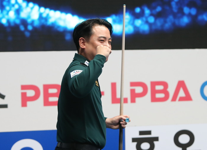 강호 강민구를 3대1로 제치고 준결승에 진출하는 조재호가 주먹을 쥐어 보이며 세러머니를 펼치고 있다[Brilliant Billiards=김철호 기자]