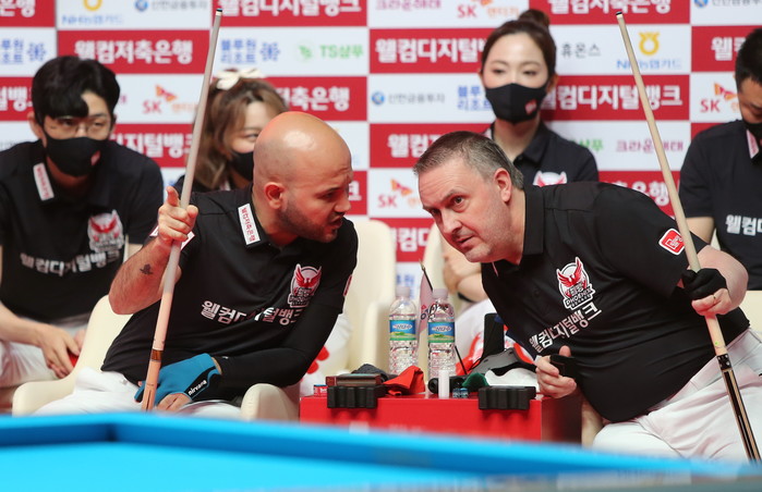 [Brilliant Billiards=김철호 기자] 19일 경기도 고양 빛마루방송센터에서 열린 ‘웰컴저축은행 PBA팀리그 2021-22’ 2라운드 6일차 경기, 1위 월컴저축은행(승점 23점)과 5위 신한금융투자(승점 16점)와의 남자복식경기에서 웰컴저축은행 쿠드롱과 위마즈가 5이닝 15대 9로 신한금융투자 마민캄과 신정주를 누르고 1승을 따냈다