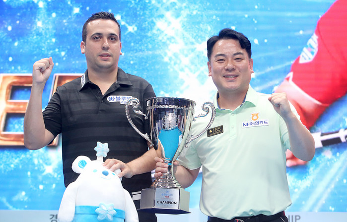 ▲투어 참피언십과는 인연이 없었던 두선수. 월드참피언 사파타와 10전11기의 첫우승타이틀을 차지한 조재호(사진제공=PBA사무국) |