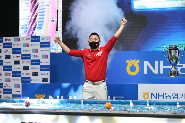 ▲  프로 당구 첫 우승을 차지한 서현민이 축포가 터지는 가운데 환호하고 있다
