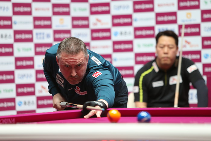 ▲ 강동궁을 뒤로 두고 볼을 조준하는 당구의 신 쿠드롱 |
