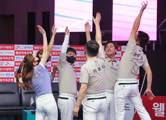 ▲TS샴프 푸라닭에게 역전승하며 단독 1위를 굳힌 하나카드 선수들이 하이파이브를 하고 있다 |