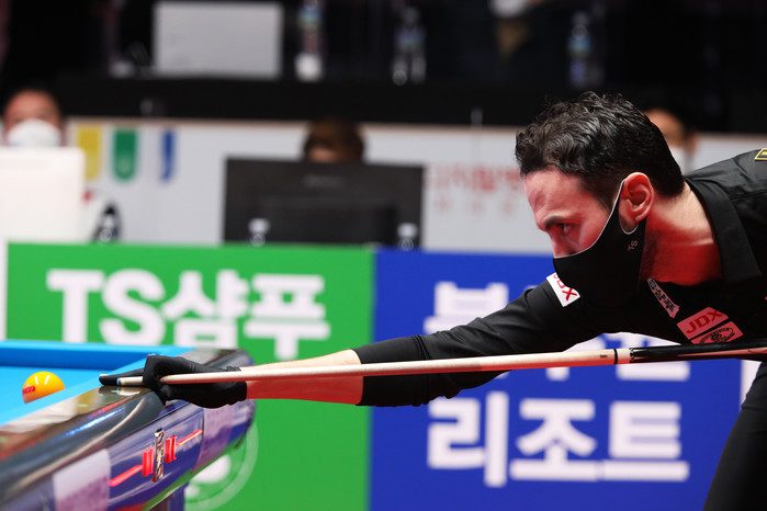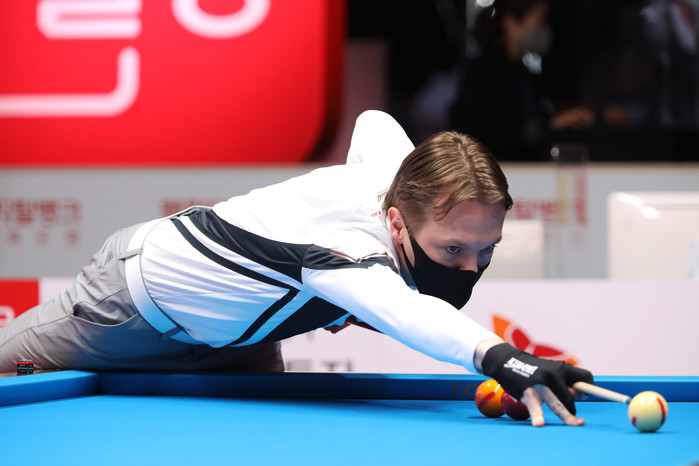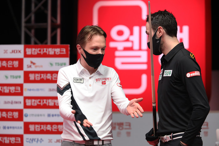 [브릴리언트 빌리아드=조용수 기자] 강서구 메이필드 호텔에서 열리는 ‘웰컴저축은행 웰뱅 PBA-LPBA 챔피언십 2021’ 8강전 23번째 경기에서 그리스의 필리포스 카시도코스타스가 네덜란드 출신의 글렌 호프만을 세트 스코아 3:1로 꺾고 4강에 진출했다.
