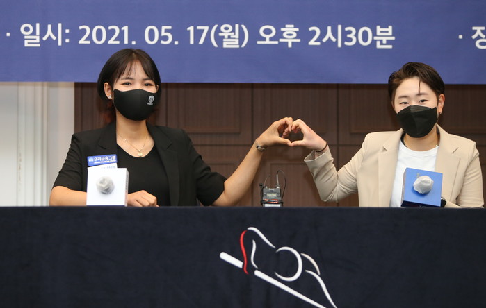두선수가 손하트를 만들어 보이며 선전을 다짐