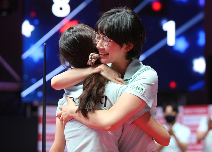 27일 팀리그 3라운드 둘째날 하나카드와 TS샴프 푸라닭의 경기 2세트 여자복식경기에서 마지막 한점을 성공시키며 승리한  TS샴프 푸라닭의 용현지를 이미래가 포옹하며 축하해주고 있다