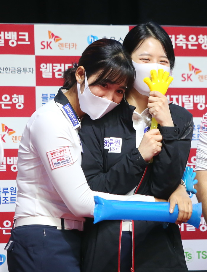 휴온스 헬스케어와의 6세트 경기에서 홍진표의 샷이 빗나가자 아쉬워하며 서한솔을 끌어 안는 스롱