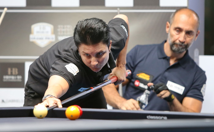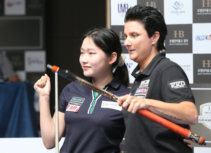 여자당구 세계 1위 클롬펜 하우어가 사이그너가 보는 가운데 샷을 준비하고 있다<원주=김철호기자>