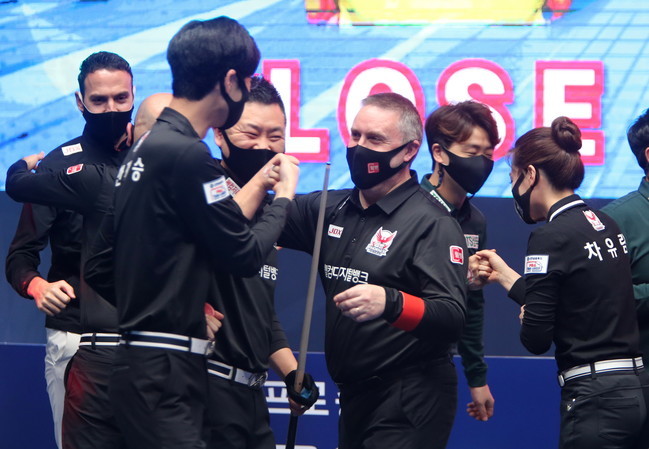 [브릴리언트 빌리아드=김철호 기자] 21일 고양 빛마루 방송센타에서 열린 신한금융투자 20-21 PBA 팀리그 3라운드 둘째날 두 번째경기 웰빙피닉스와 11승 무패의 TS.JDX의경기에서 어제 SK렌터카에 패하고 올라온 웰빙피닉스의 쿠드롱이 남자복식경기에서 2세트만에 혼자 15점을 따내며 완봉승을 거두었다