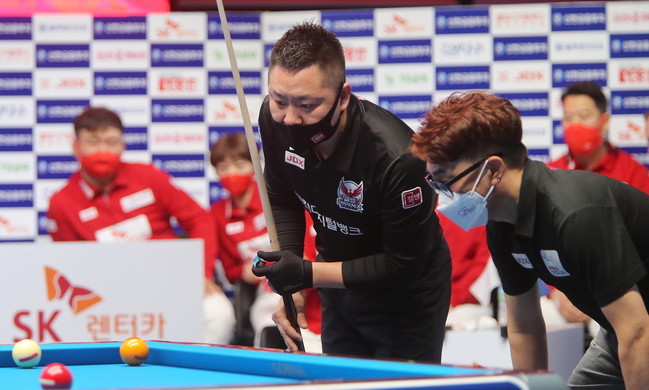 [브릴리언트 빌리아드=김철호 기자] 1일 고양 빛마루 방송센타에서 열린 신한금융투자 20-21 PBA 팀리그 4라운드 넷째날 첫번째경기 웰빙피닉스와 SK렌터카 경기에서 지금까지 한번도 이겨보지 못한 SK렌터카를 상대로 4대1로 승리하며 전팀 승리를 자리매김한 웰빙피닉스 남자 단식 서현민이 SK렌터카 김형곤을 상대로 마지막 두점짜리 뱅크샷을 친후 공의 움직임을 주시하고 있다.