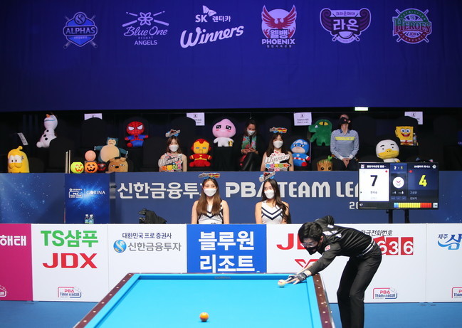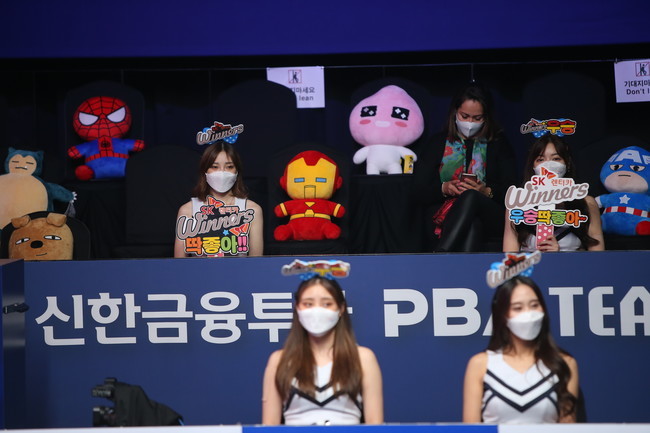 [브릴리언트 빌리아드=김철호 기자] 1일 고양 빛마루 방송센타에서 열린 신한금융투자 20-21 PBA 팀리그 4라운드 넷째날 첫번째경기 웰빙피닉스와 SK렌터카 경기. 3라운드를 치루는 동안 사라졌던 캐릭터 인형들이 관중석에 자리를 잡으며 무관중의 아쉬움을 달래고 있다.