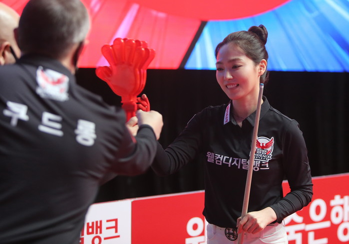 ▲ 뱅크샷 5개로 승리를 얻어낸 차유람을 동료선수들이 축하해주고 있다[Brilliant Billiards=김철호 기자] |