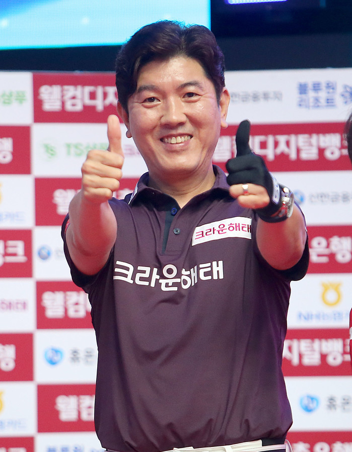 ▲블루원리조트와의 6세트에서 홍진표를 누르고 귀중한 승리를 따낸 크라운해태 팀리더 김재근선수가 엄지척을 선보이고 있다<PBA 사무국제공> |