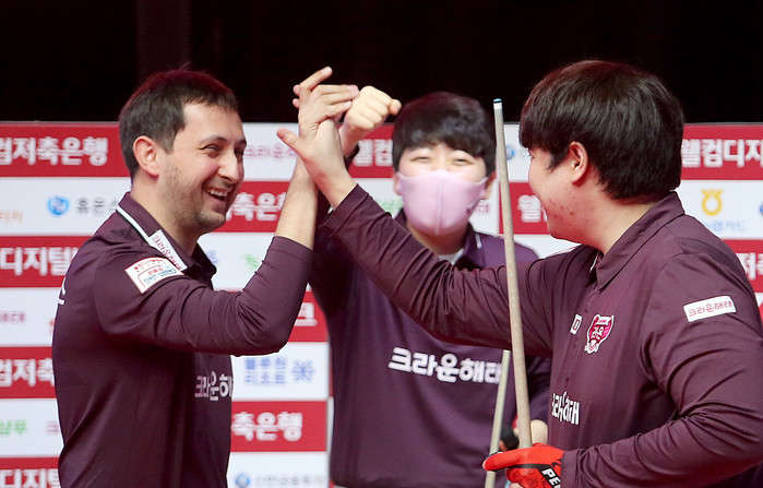 [Brilliant Billiards=서형석 기자] 크라운해태가 두 세트를 내주고 내리 네 세트를 따내 휴온스를 세트스코어 4:2로 꺾고 4라운드 단독 선두로 올라섰다.