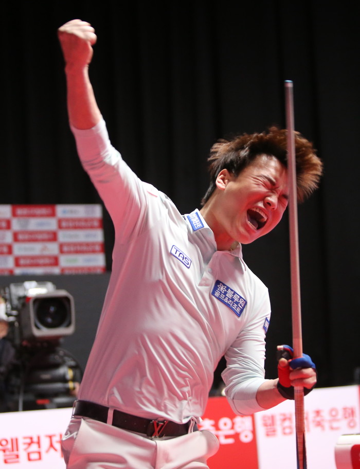 ▲4전5기의 강민구가 우승이 확정되자 주먹을 쥐어보이며 환호하고 있다 |