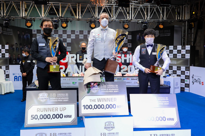 [Brilliant Billiards=김철호 기자] 우승 상금 1억 원이 걸린 '호텔 인터불고 원주 월드3 쿠션 그랑프리 2021' 대회가 세계 랭킹 1위 딕 야스퍼스의 우승으로 끝났다.