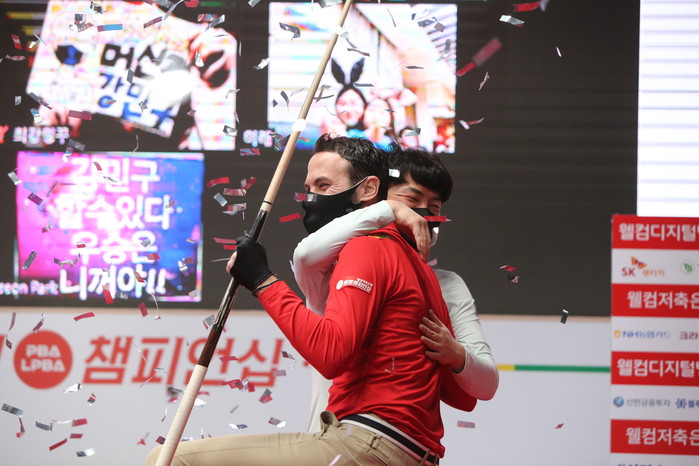 ▲우승함 카시도코스타스를 안으며 축하해주는 강민구선수 |