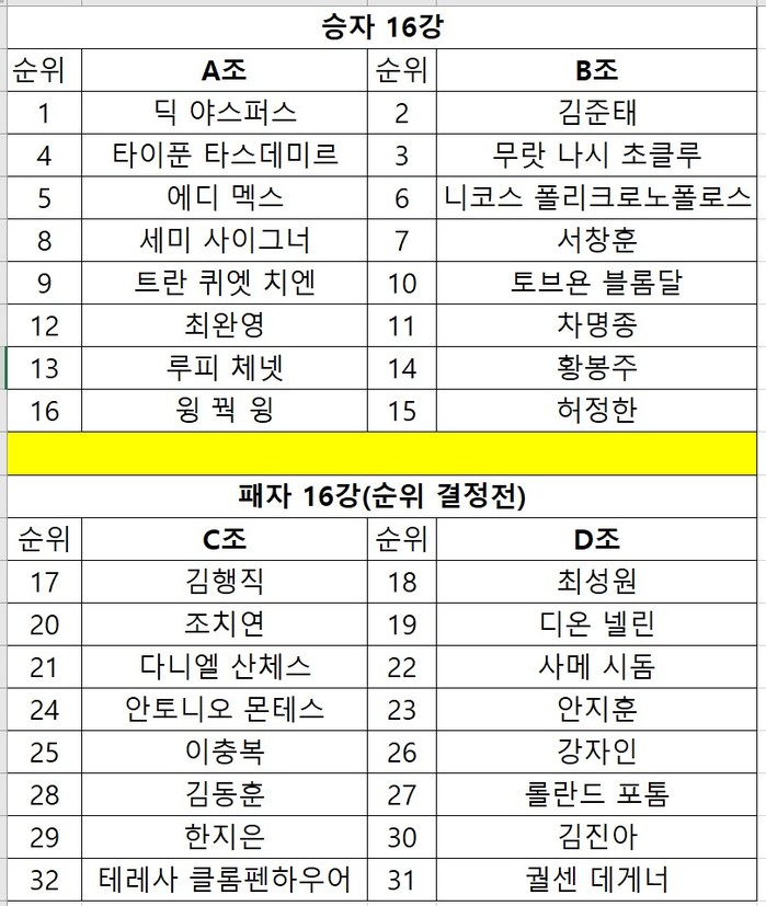 D조의 타이푼 타스데미르, 서창훈, 차명종, 루피 체넷도 16강에 진출했다