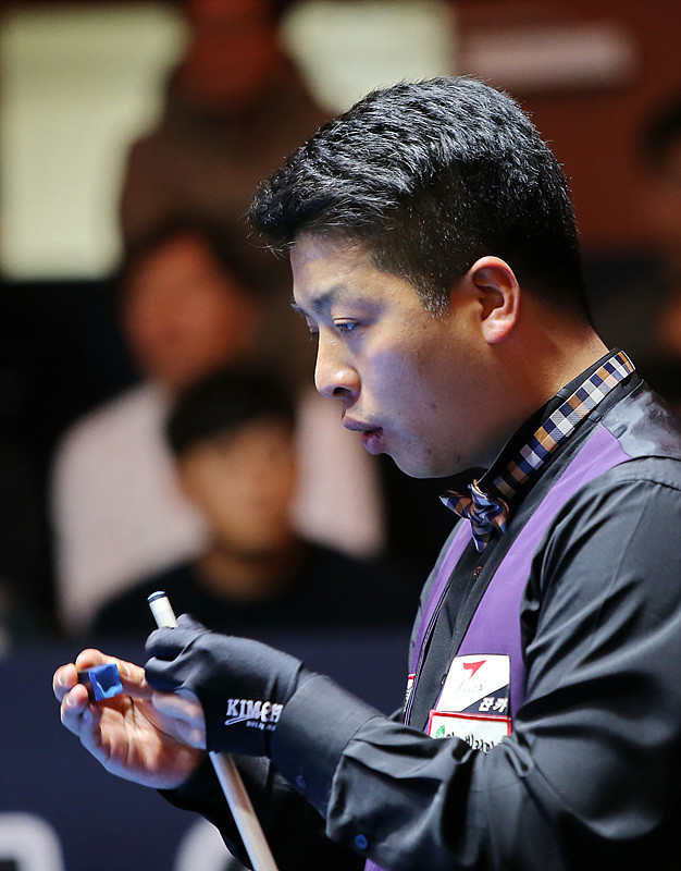큐에 쵸크를 칠하며 샷을 연구하는 황영범선수