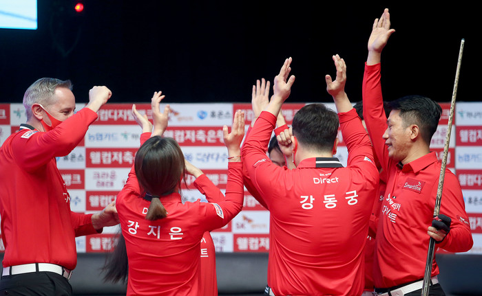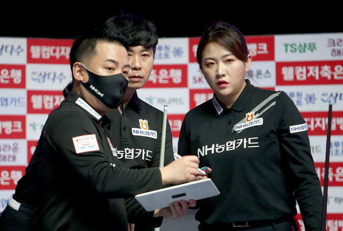 전날까지 5연승 가도를 내달린 NH농협카드는 라운드 최종일서도 여세를 몰아 크라운해태를 제압했다. ‘팀 리더’ 조재호와 김현우, 김민아가 나란히 2승씩을 챙기며 팀 승리를 견인했다. 1세트 조재호와 김현우가 김재근-박한기를 상대로 11:7(8이닝) 승리한 데 이어, 2세트서는 김민아-김보미가 임정숙-백민주를 9:8(9이닝) 한 점차로 물리쳤다.