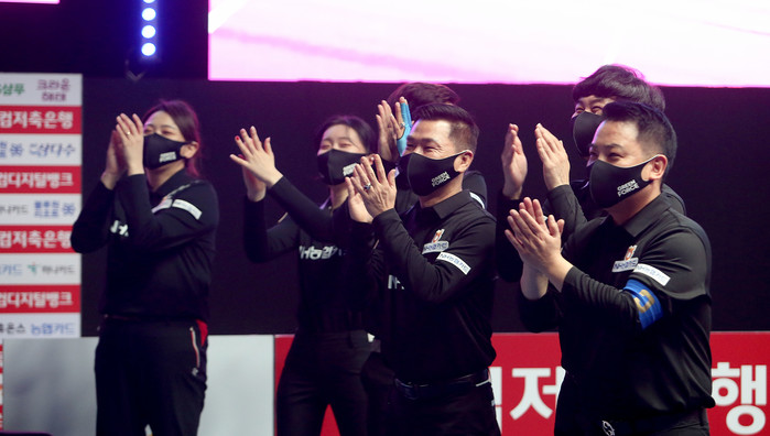 [Brilliant Billiards=박상현 기자] NH농협카드가 PBA 팀리그 이번 시즌 최다 연승(6연승)을 쌓아올리며 후기리그를 단독 1위로 출발했다. 또 SK렌터카는 5연승을 거두며 완벽하게 부진에서 탈출, 웰컴저축은행과 공동 2위에 올랐다. 17일 경기도 고양시 빛마루방송지원센터에서 열린 ‘웰컴저축은행 PBA 팀리그 2022-23’ 4라운드 최종일 경기를 끝으로 후기리그 첫 라운드가 종료됐다. 최종일서 NH농협카드는 크라운해태에 세트스코어 4:0 완승을 거두었고, SK렌터카는 하나카드와 풀세트 끝에 4:3 승리했다. 웰컴저축은행은 휴온스를 세트스코어 4:3, 블루원리조트는 TS샴푸·푸라닭을 세트스코어 4:2로 눌렀다.